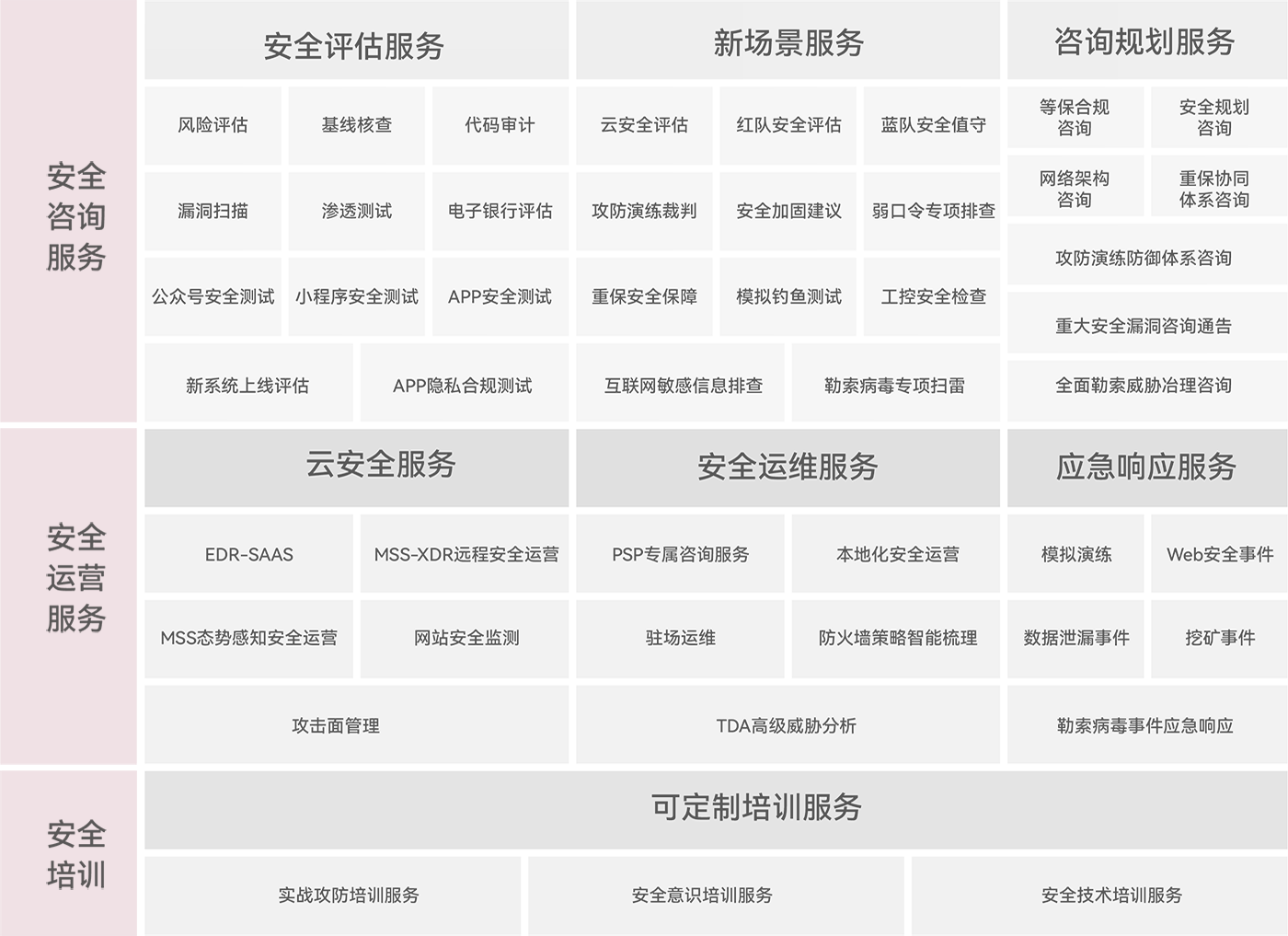 亞信安全以安全咨詢、安全運營、安全培訓(xùn)三個維度結(jié)合47項安服業(yè)務(wù),推出場景化安全服務(wù)體系。