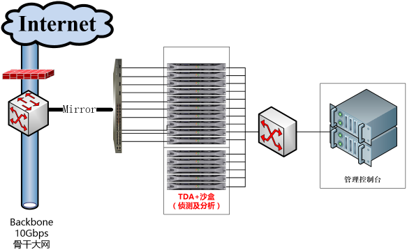 針對(duì)正處在日新月異的發(fā)展階段的校園網(wǎng)絡(luò),亞信安全建議采用交換機(jī)鏡像方式旁路部署信桅 深度威脅發(fā)現(xiàn)設(shè)備TDA,同時(shí)將該設(shè)備通過(guò)互聯(lián)網(wǎng)接入亞信科技在上海設(shè)立的威脅監(jiān)測(cè)中心